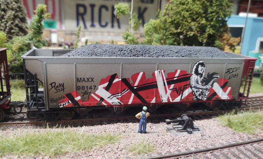 Good Times Gone? A track worker admires a rolling tribute to one of the greatest rock guitarists of our time, the late Eddie Van Halen. Rick Dakota Kempf shared this custom-decorated hopper.