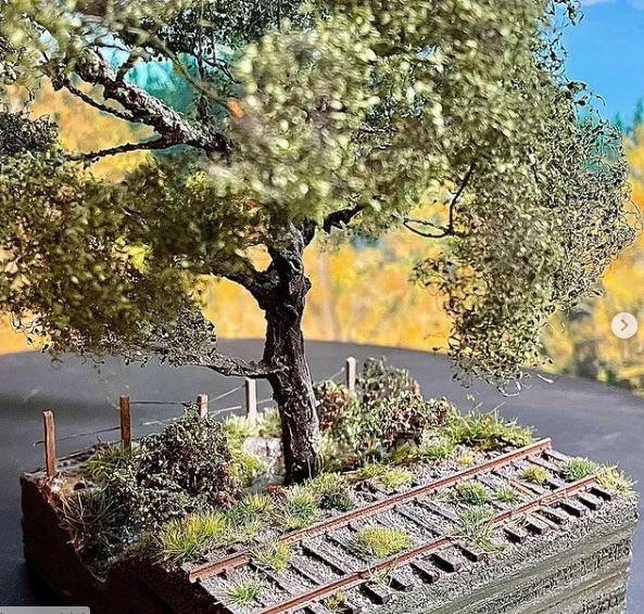 It’s been a long time since a train brushed by the branches of this old tree. The lonely line is on its way to being reclaimed by the forest. Click on the white arrows to enjoy the surprising amount of detail packed into this mini-diorama created by @mountaingoatmodels.