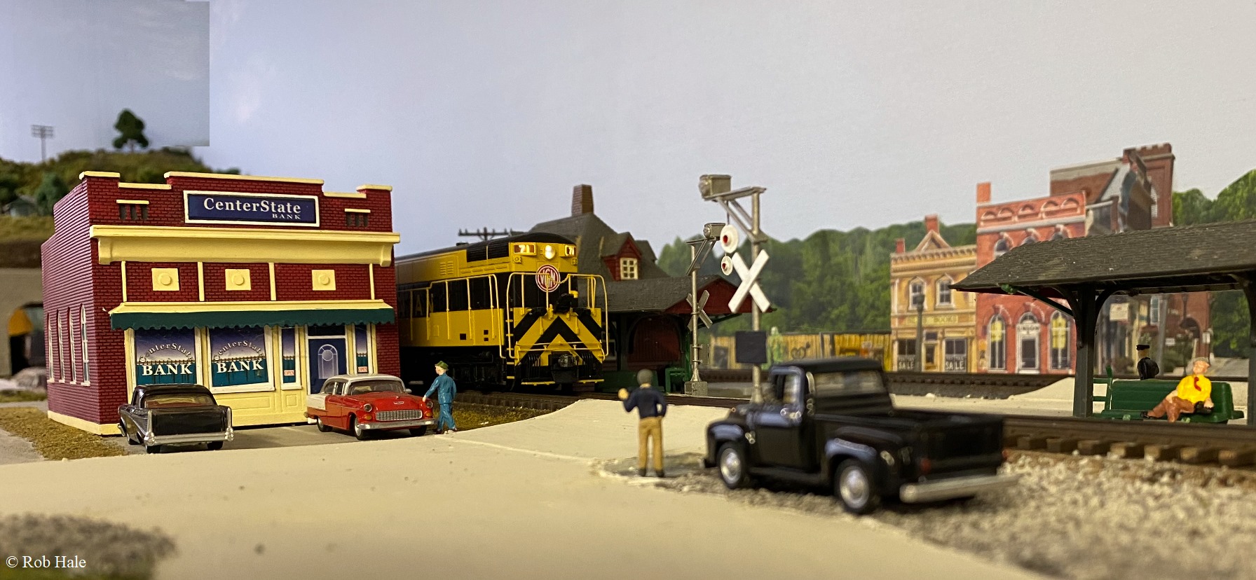 A railfan steps out of his truck to wave at the passing freight in this scene modeled by Rob Hale. Automobiles with tailfins parked in town and a black-and-yellow Virginian diesel barreling along the main, firmly set this HO scale railroad in 1950s Appalachian coal country. |