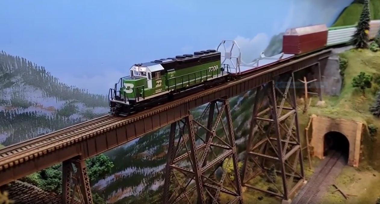 Burlington Northern SD40 no. 7309 leads a special train of the widest, tallest, and longest equipment on the Rainier Great Western Ry., including a clearance flatcar, Skybox car for airliner components, a loaded centerbeam flatcar and an enclosed auto carrier. The train sure looks cool, but it also serves to test the layout’s trackwork and scenery placement to make sure this extra-large rolling stock doesn’t take out a tree or structure. Follow @rgwrail to see more videos and photos of this mountain railroad. |