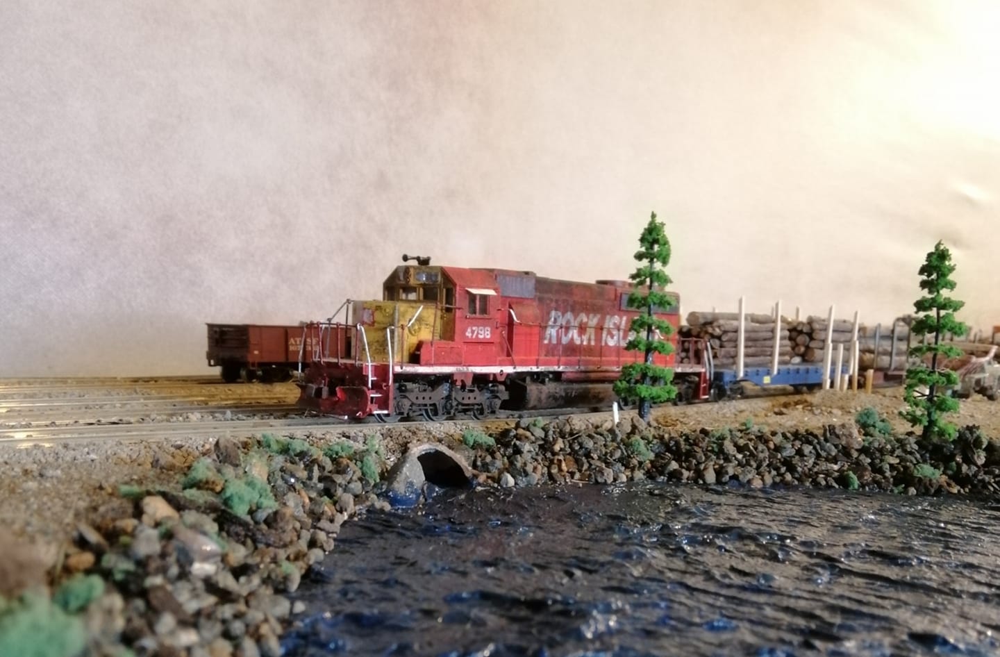 along the Rock An SD40-2 leads a cut of lumber flatcars on the Rock Island main on Bud Hansen’s layout. Bud modeled the water with toilet paper and white glue to create the wavy surface, followed by paint and gloss medium.