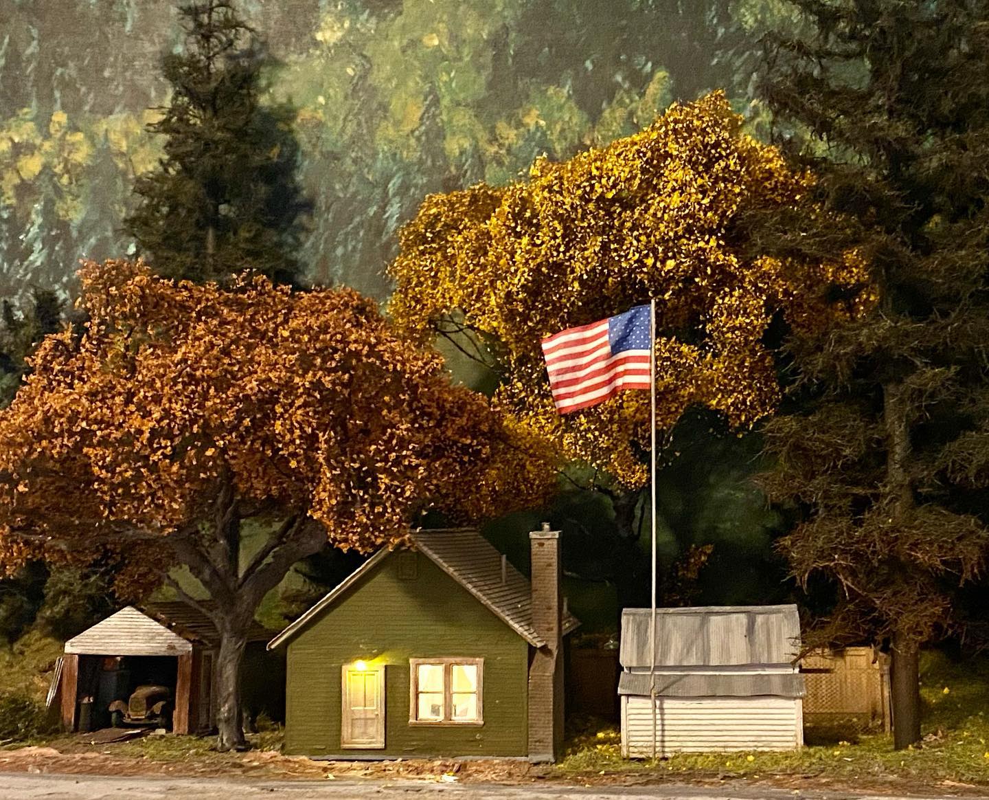 Old Glory flies proudly above this charming homestead on the HO scale model railroad built by Mountain Goat Models. Some of his superdetailed structures, including the house above, feature interior and exterior lighting. |