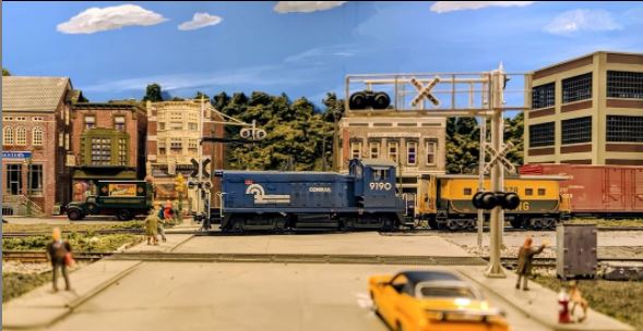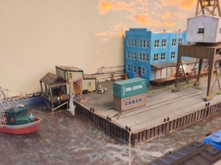 It’s a busy day at the Gotham Piers. While the traveling crane lifts containers onto rail cars, local fisherman haul in quite the catch of their own. Follow @bkderailed to see more of this scene, which is also an entry in this year’s National Model Railroad Build Off!