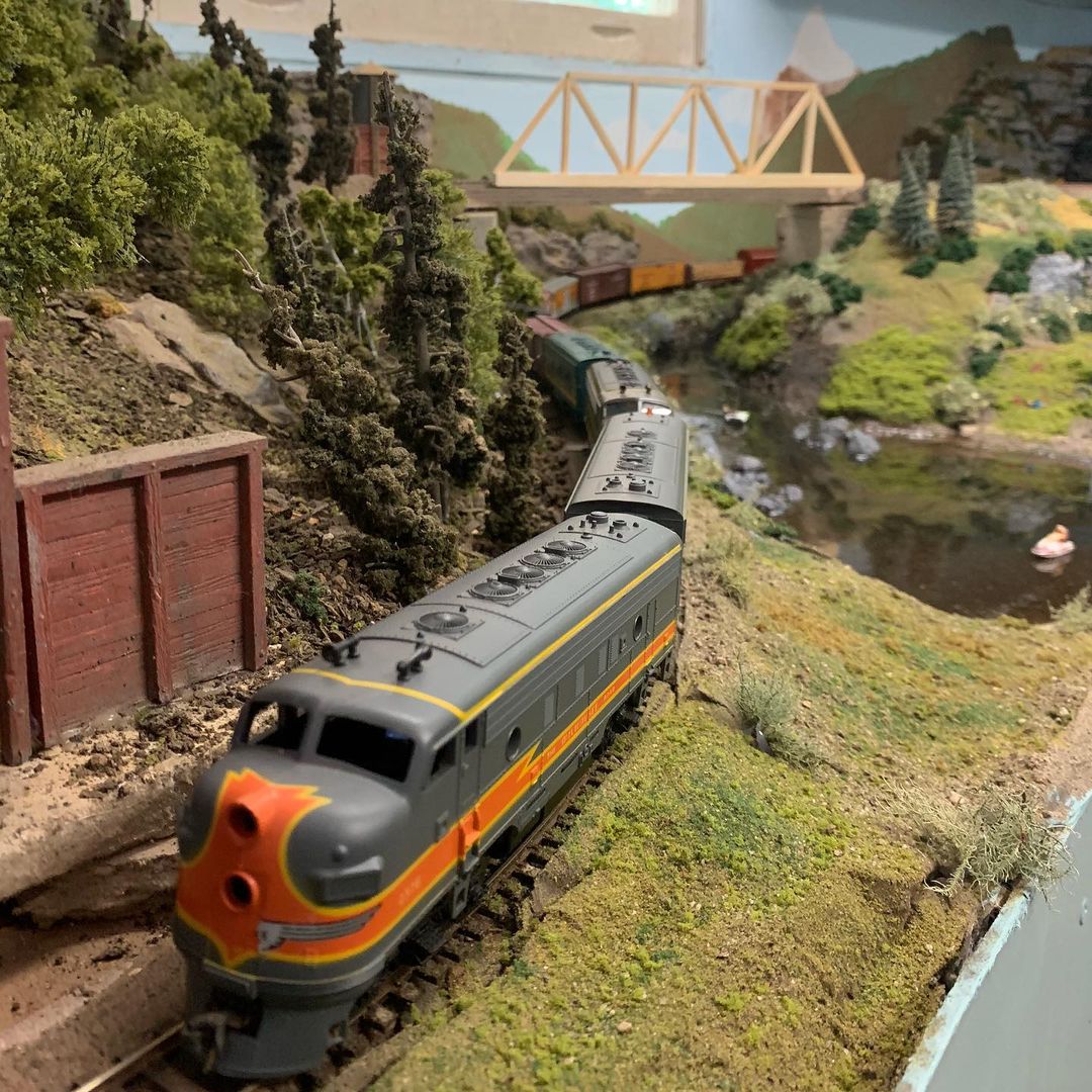 Led by a trio of EMD F units, a fast freight snakes along the riverbank on the HO scale Rodgers RR. Click on the arrows to see more views of this detailed scene posted by @rodgers_rail_and_freight.