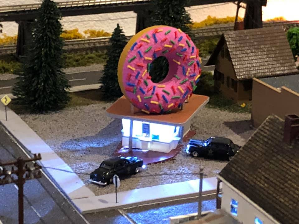 The City’s Finest stop in for a snack in this scene on Don Davis’ model railroad. Along with a colorful paint job complete with sprinkles, Don’s donut shop features custom interior lighting.