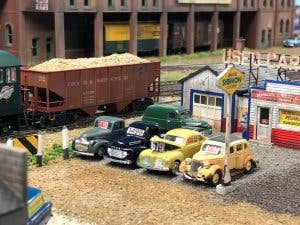 Collector or hotrodder, we'd love to test-drive these low-mileage beauties waiting for a new owner on John Mueller's layout. On the street or on display, vehicles really set the scene without needing a lot of space.