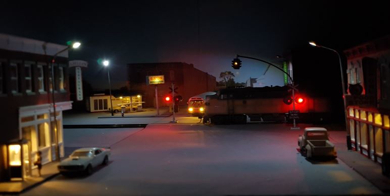 Daylight is on the horizon, as this small town begins to wake up. With its horn blaring, the freight crossing main street is better than an alarm clock for any downtown residents. Modeler Mike Light went all out illuminating this late night/early morning scene.