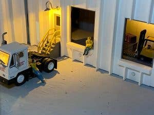 In between deliveries the workers at this warehouse take a load off. John C-Fly Hinson carefully arranged figures, vehicles and interior details to create this vignette on his model railroad.
