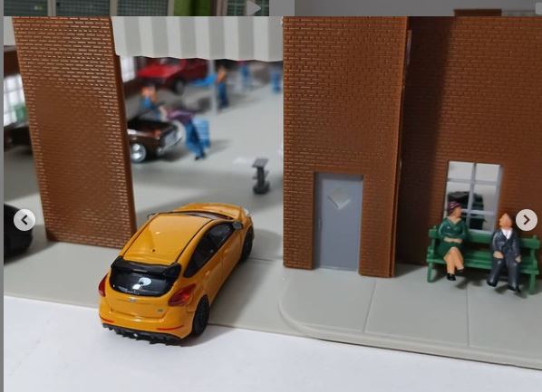 There’s no shortage of customers for this busy auto repair shop. Poster @diecastemporium detailed this HO structure inside and out. Click on the white arrows to see more views of this scene.