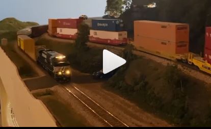 Headlights blaze the way as a Norfolk Southern intermodal takes the high line and a hotshot freight barrels along the main below. Even in the low light of morning the classic NS “Thoroughbred” scheme is still visible on the locomotives. This action takes place on the layout built by poster @ns_csx_mytownmodeler. |